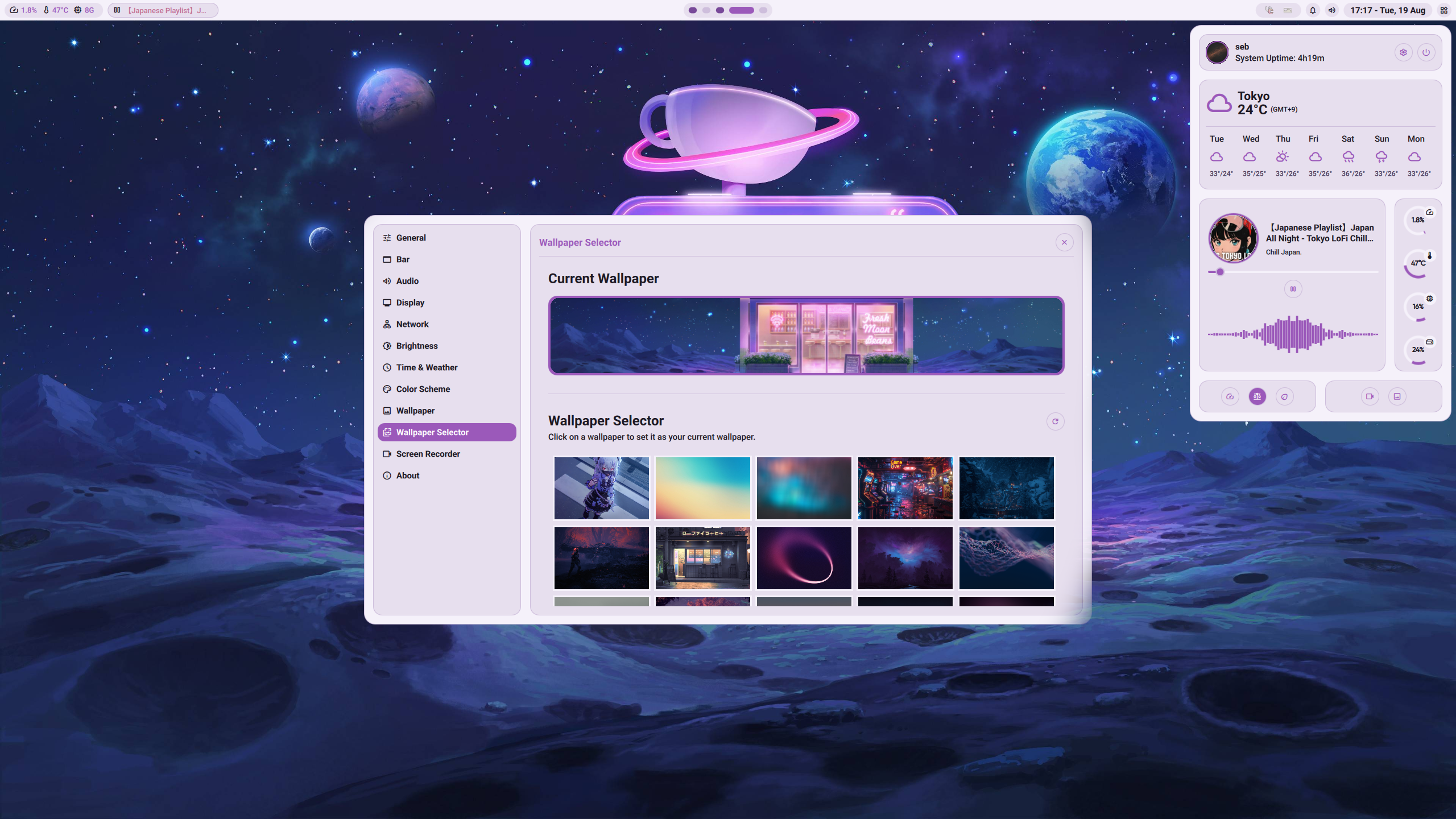 • Audio Integration: Volume controls, media playback, and audio visualizer (cava-based).